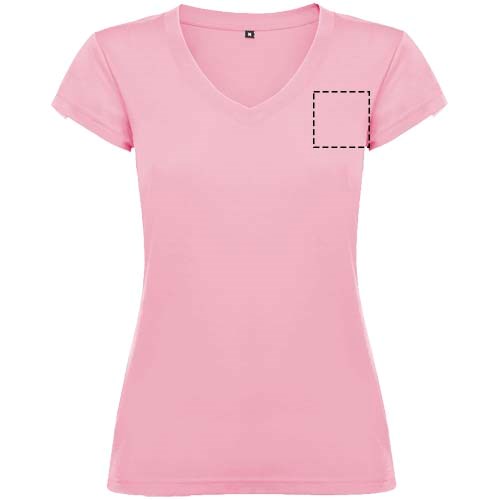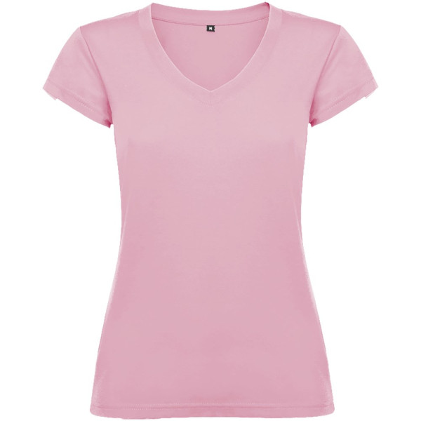 T-shirt met korte mouwen en V-hals voor dames, met 1x1 geribbelde afwerkingen. Slim-fit met zijnaden. Verwijderbaar etiket. Het model is 174 cm en draagt maat S.