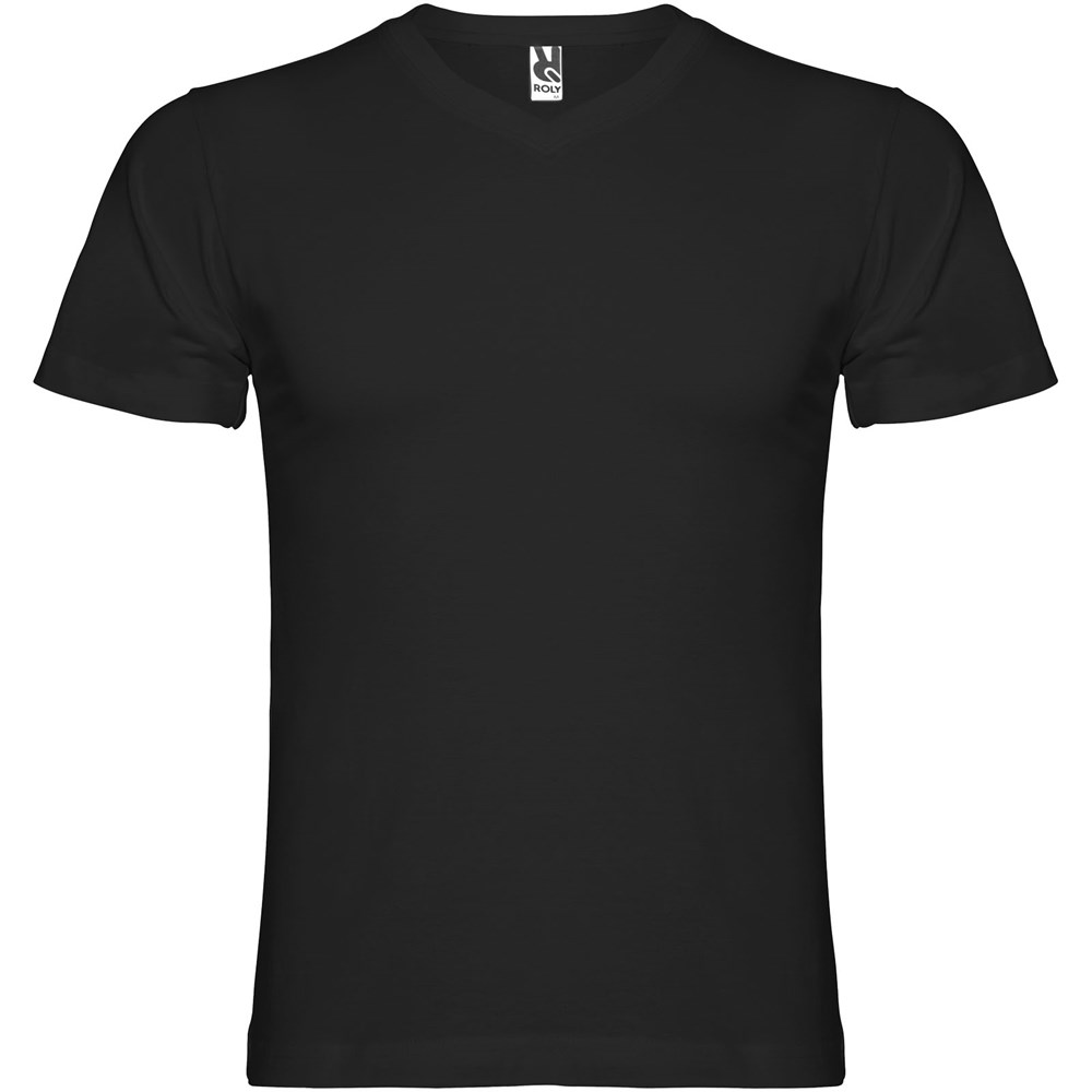Buisvormig T-shirt met korte mouwen en tweelaags V-hals. Versterkte bedekte naden in kraag en schouders. Verwijderbaar etiket. Het model is 190 cm en draagt maat L.
