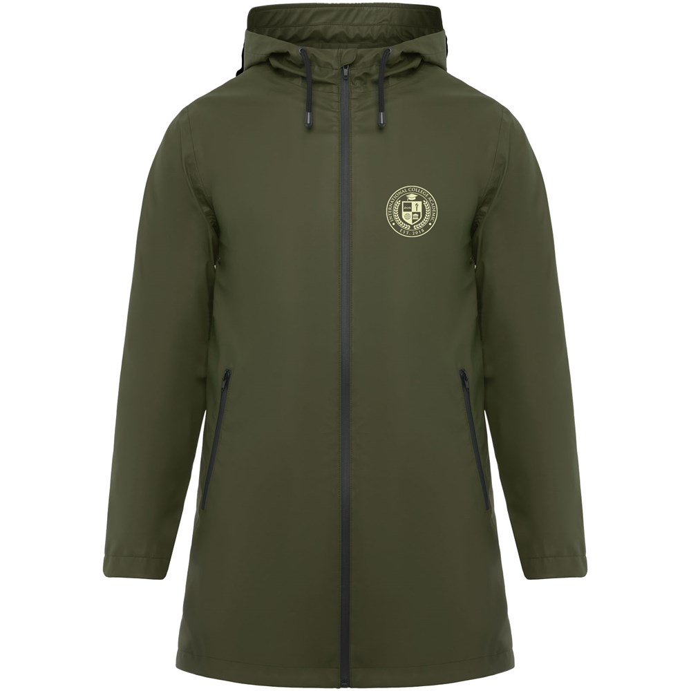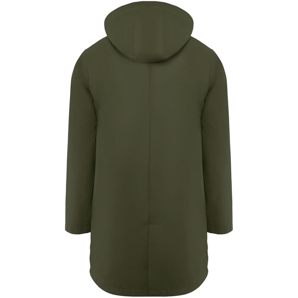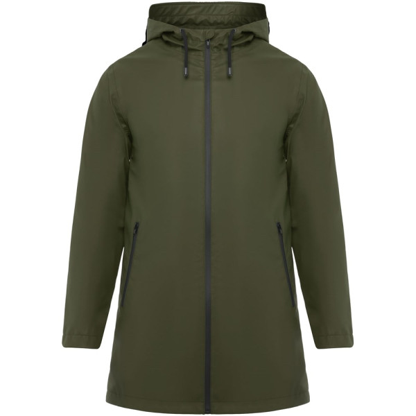 Waterdichte regenjas. Capuchon met klep. Door hitte gesealde ritsen en naden. Contrasterende details in zwart. Twee zijzakken met rits. Split aan de achterkant. Verwijderbaar etiket. Waterbestendig. Het model is 185 cm en draagt maat M.