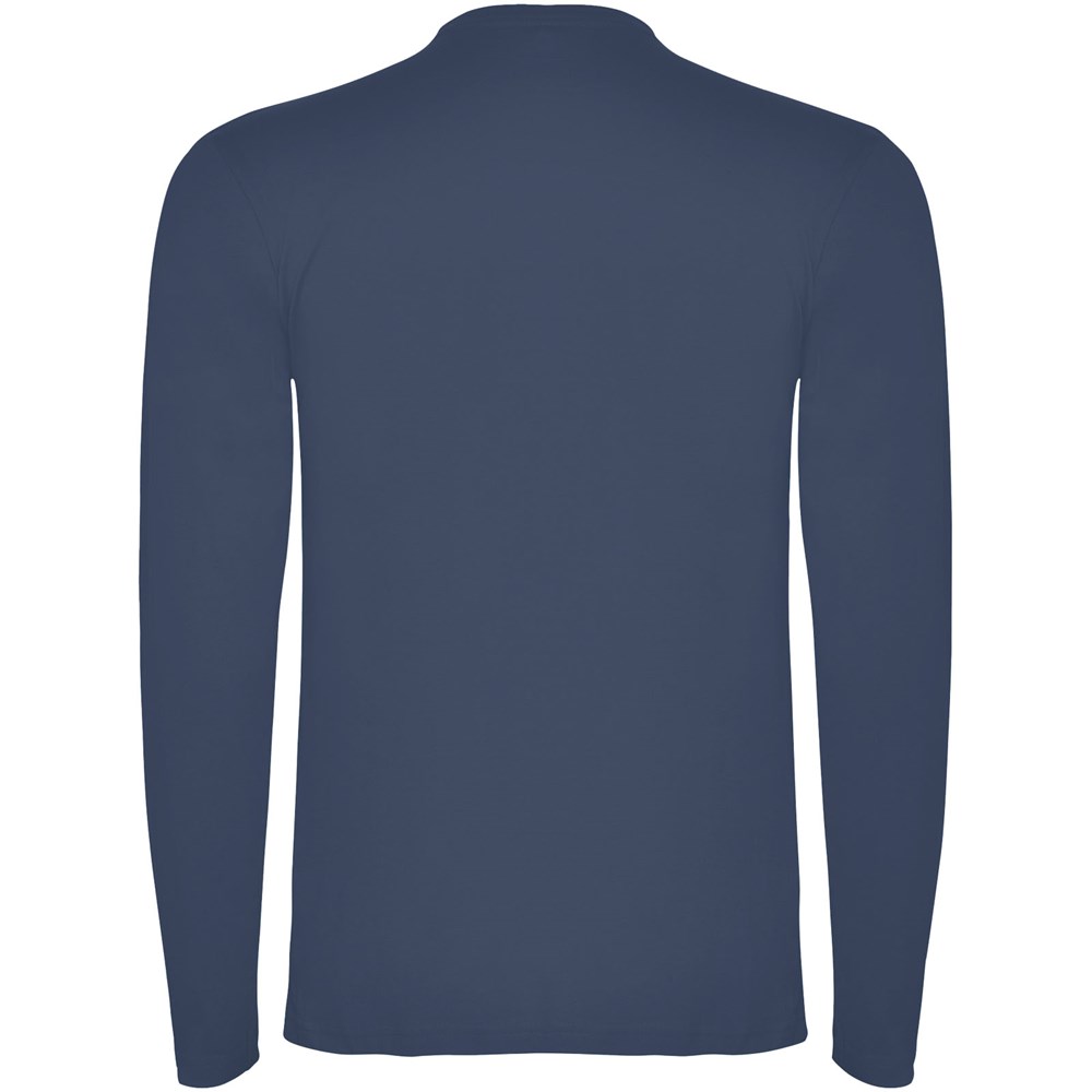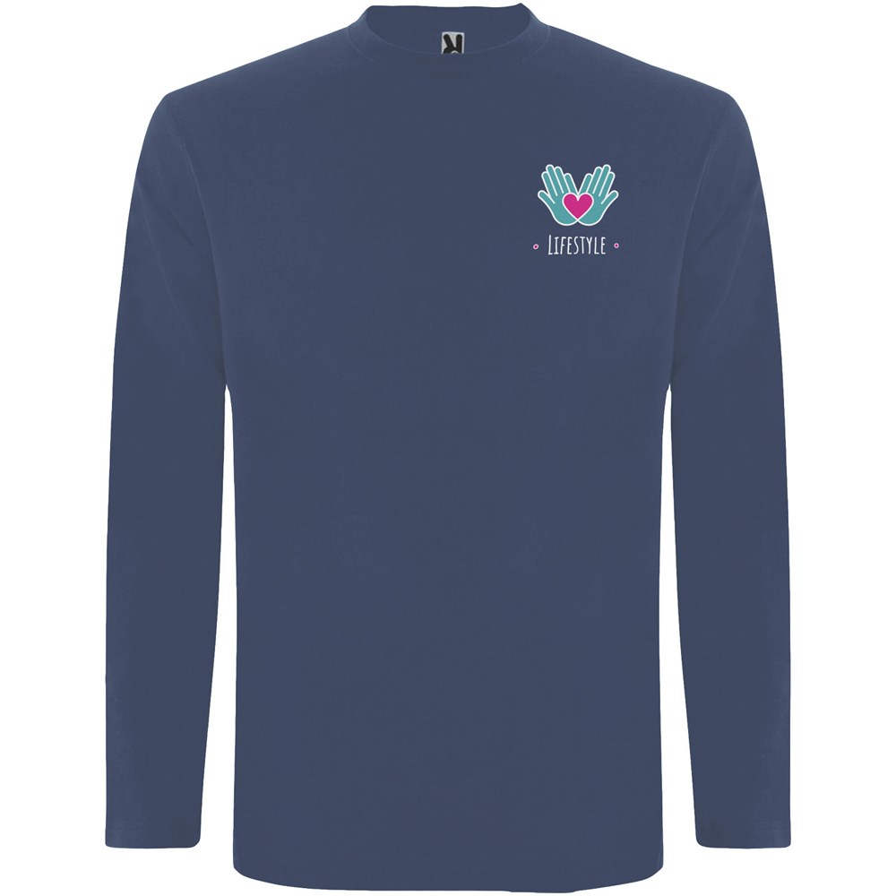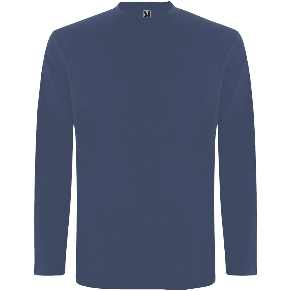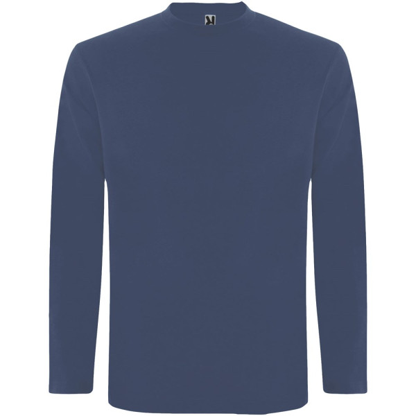 T-shirt met lange mouwen van buisvormige stof en 4-laags ronde hals. Versterkte bedekte naden in kraag en schouders. Geen manchetten. Verwijderbaar etiket. Buisvormig ontwerp in volwassen maten en zijnaden in kindermaten. Het model is 185 cm en draagt maat L.