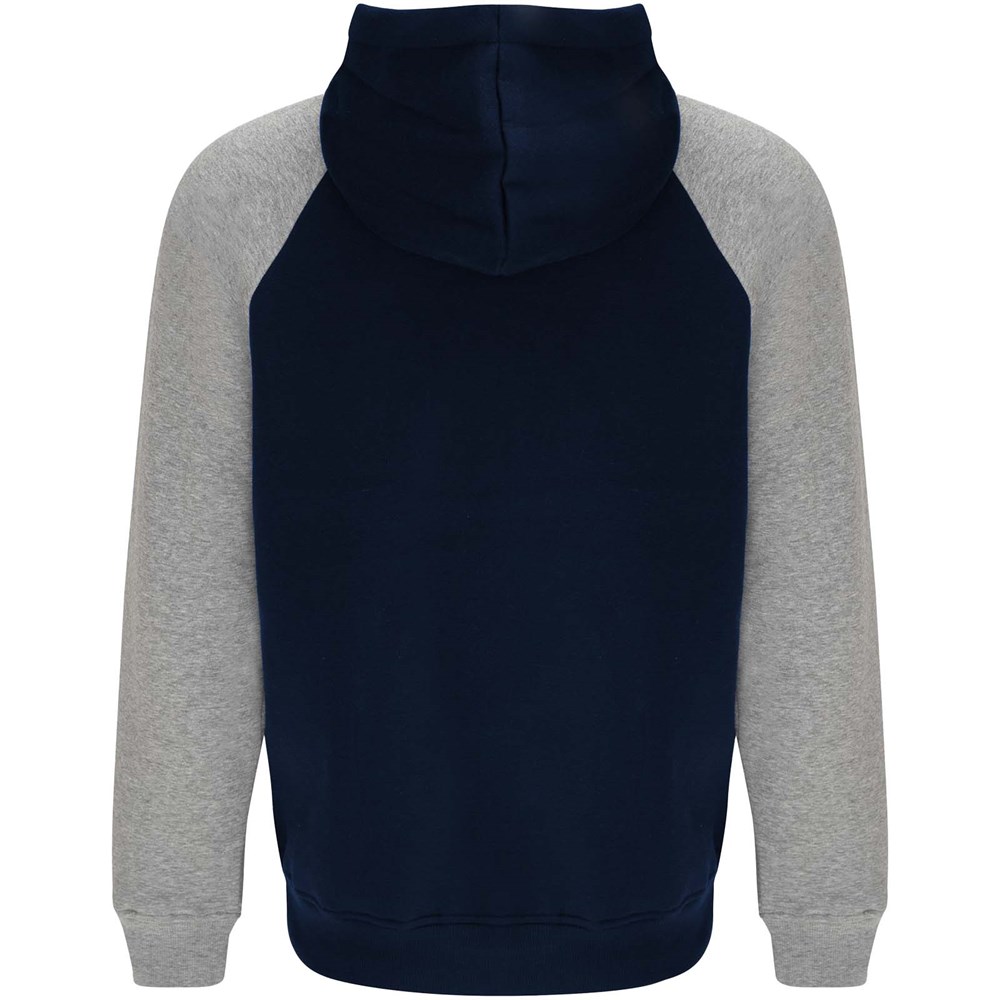 Tweekleurige unisex hoodie. Capuchon met gekruiste hals en metalen oogjes. Contrasterende binnenkant van de capuchon, trekkoord en raglanmouwen. Kangoeroezak. Manchetten en zoom van 1x1 ribgebreid elastaan. Verwijderbaar label.