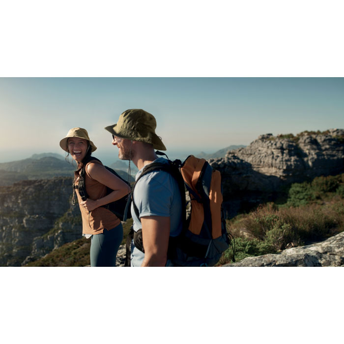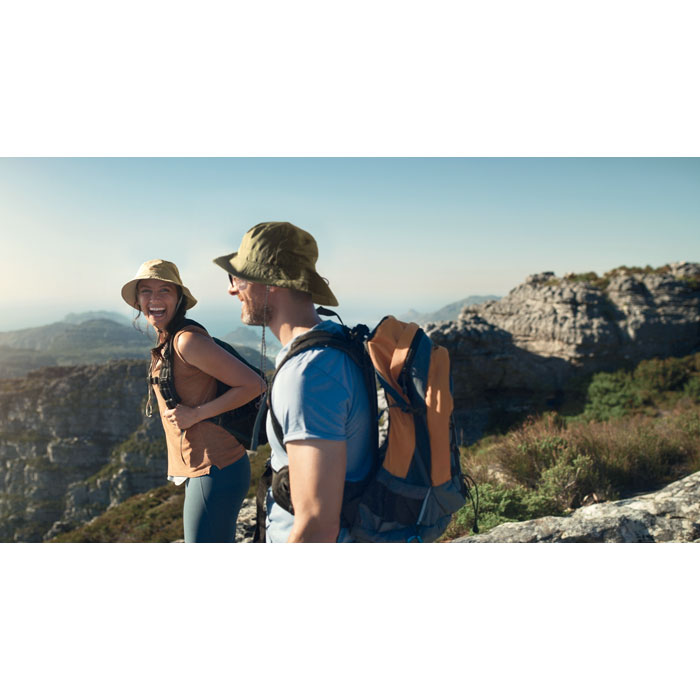 Waterafstotend vissershoedje van polyester, met geïntegreerd zakje aan de binnenkant van hetzelfde materiaal met ABS karabijnhaak. 64g/m².