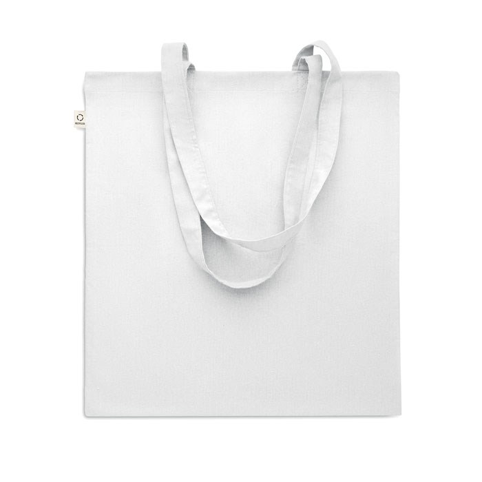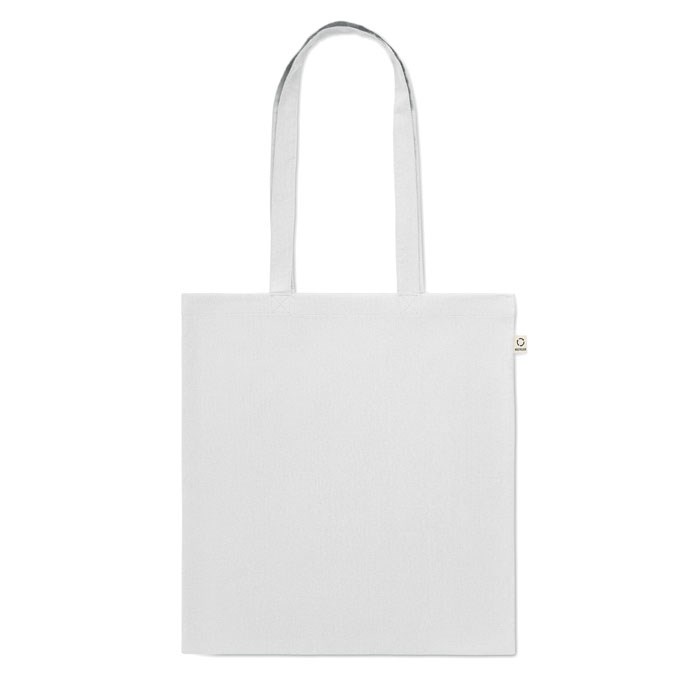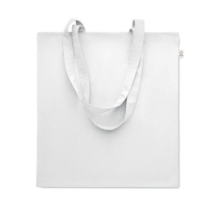 Gerecyclede pre-consumer katoenen boodschappentas (70% gerecycled katoen en 30% RPET) met lange hengsels. 140 gr/m². Dit artikel kan krimpen na het afdrukken.