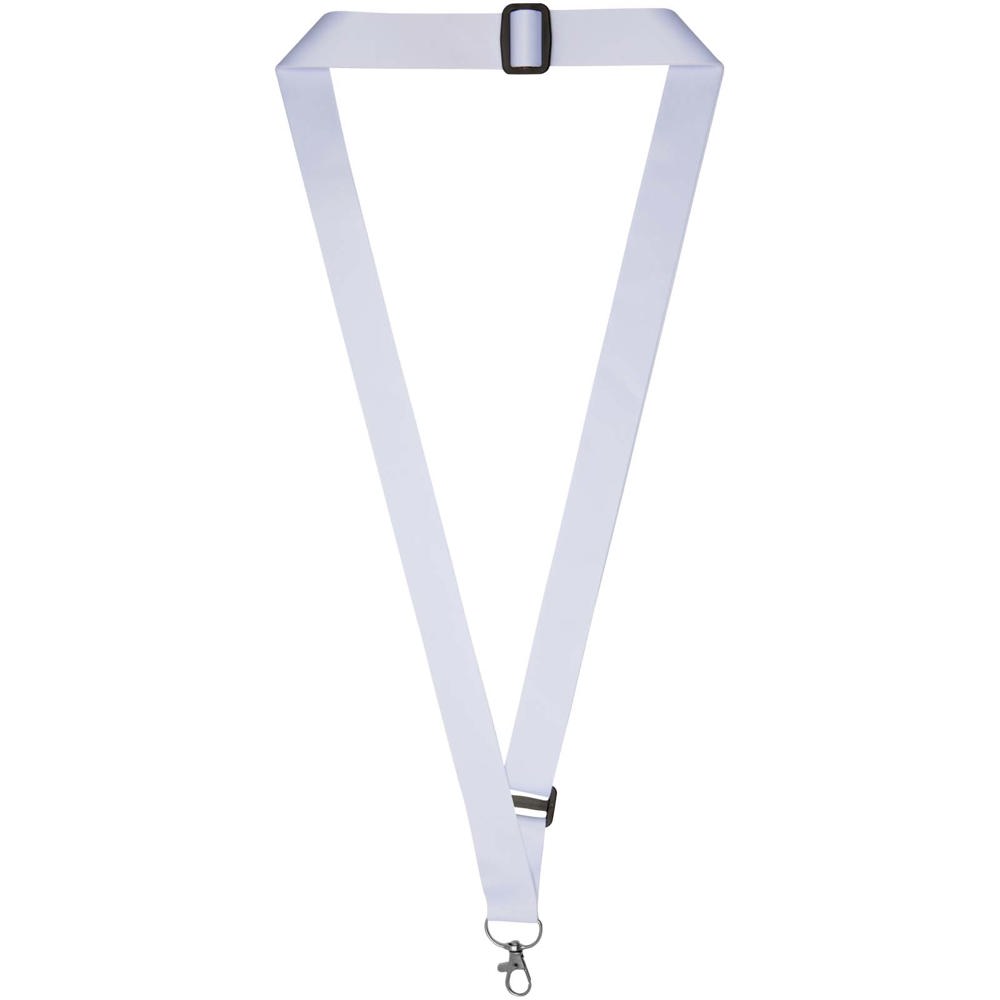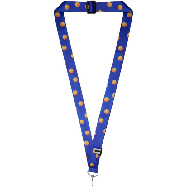 De verstelbare lanyard is voorzien van een schuifgesp waarmee de lengte eenvoudig kan worden aangepast, en een stevige metalen haak om een naamkaartje, ID-kaart of sleutels veilig vast te houden. De lanyard kan enkel- of dubbelzijdig bedrukt worden, met keuze uit standaard of “fitted” dubbelzijdige bedrukking (bij fitted lopen de ontwerpen aan beide zijden precies op elkaar). Gemaakt in Europa.